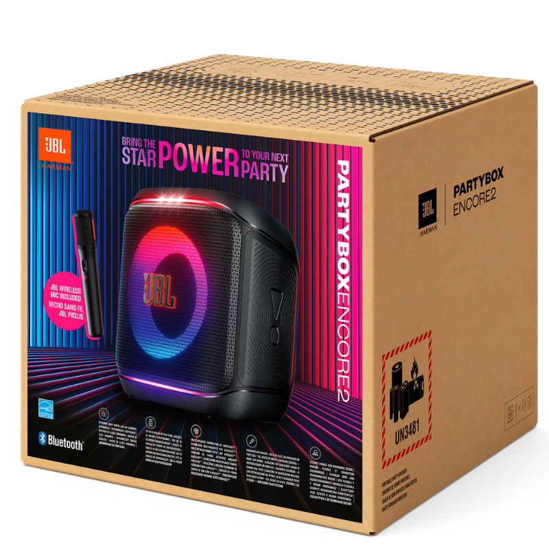 The JBL PartyBox Encore 2 Portable Party Speaker with Mic is a compact, all‑in‑one Bluetooth party speaker designed to bring powerful JBL sound, deep bass and fun karaoke to any living room, garden or small venue. With its included wireless microphone, the PartyBox Encore 2 is perfect for karaoke nights, birthdays, family gatherings, school functions and small events.